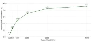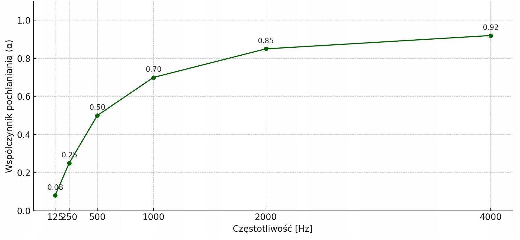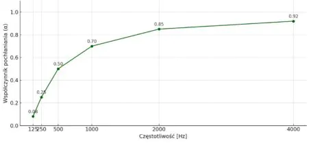 Wykres przedstawia współczynnik pochłaniania dźwięku pianki akustycznej gładkiej grubości 4 cm. Dane bazują na ogólnych właściwościach pianki poliuretanowej o strukturze komórek otwartych i mają charakter poglądowy.